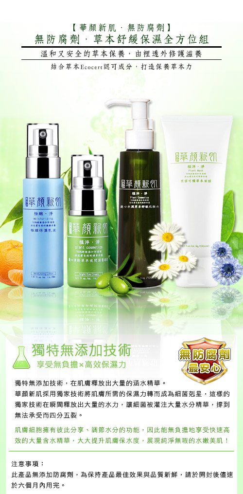 【華顏新肌】無防腐劑.草本舒緩保濕全方位組【保濕乳液50ml 舒敏化妝水120ml 夜間滋養眼霜15ml 草本面膜100ml】
